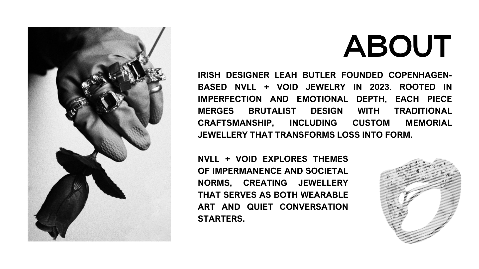 bio Leah Butler is an Irish jewelry designer whose work bridges history, folklore, and social justice. Based in Copenhagen, she has been immersed in the jewelry world since 2018, shaping a practice that values emotional resonance over ornamentation. Leah is the founder of NVLL+VOID and co-founder of Negative Space, a concept store dedicated to emotionally resonant design and collaborative resistance. “I’m driven by the tension between the unconventional and the sentimental” — Leah