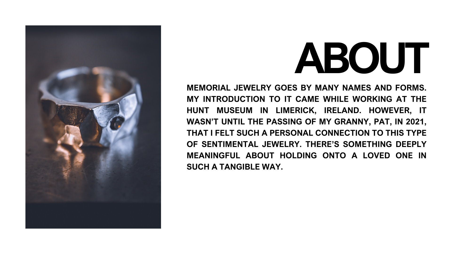 Memorial jewelry goes by many names and forms. My introduction to it came while working at the Hunt Museum in Limerick, Ireland. However, it wasn’t until the passing of my granny, Pat, in 2021, that I felt such a personal connection to this type of sentimental jewelry. There’s something deeply meaningful about holding onto a loved one in such a tangible way. A (very) Brief History. Memorial jewelry dates back to ancient civilizations like Rome and Egypt, where it included rings with bones and teeth. The Victorian era saw its peak, with Queen Victoria's mourning for Prince Albert influencing trends. Mourning jewelry featured materials like jet, human hair, and black enamel, often adorned with symbols of death such as skulls and urns. Recently, memorial jewelry has become more personalized, often incorporating a loved one's cremated remains, hair, or fur. It offers a meaningful way to keep loved ones close, with pieces serving as sweet reminders. Choosing the right term for my custom memorial work has been tricky, as it’s known by many names like Keepsake Jewelry, Cremation Jewelry, and Tribute Jewelry. I chose “Memorial” because it offers flexibility in materials and focuses more on honoring loved ones than on grief. Memorial jewelry blends tradition with modern design, creating a meaningful connection between the past and present.